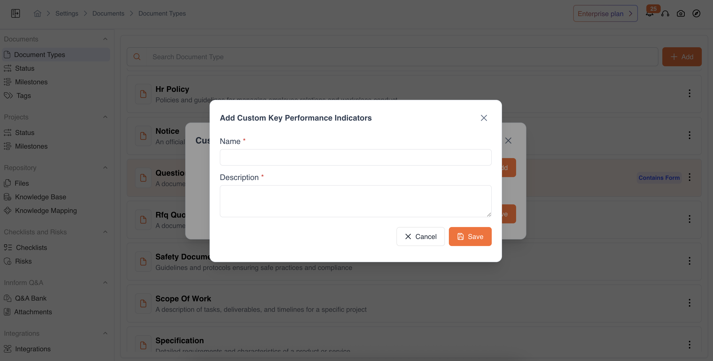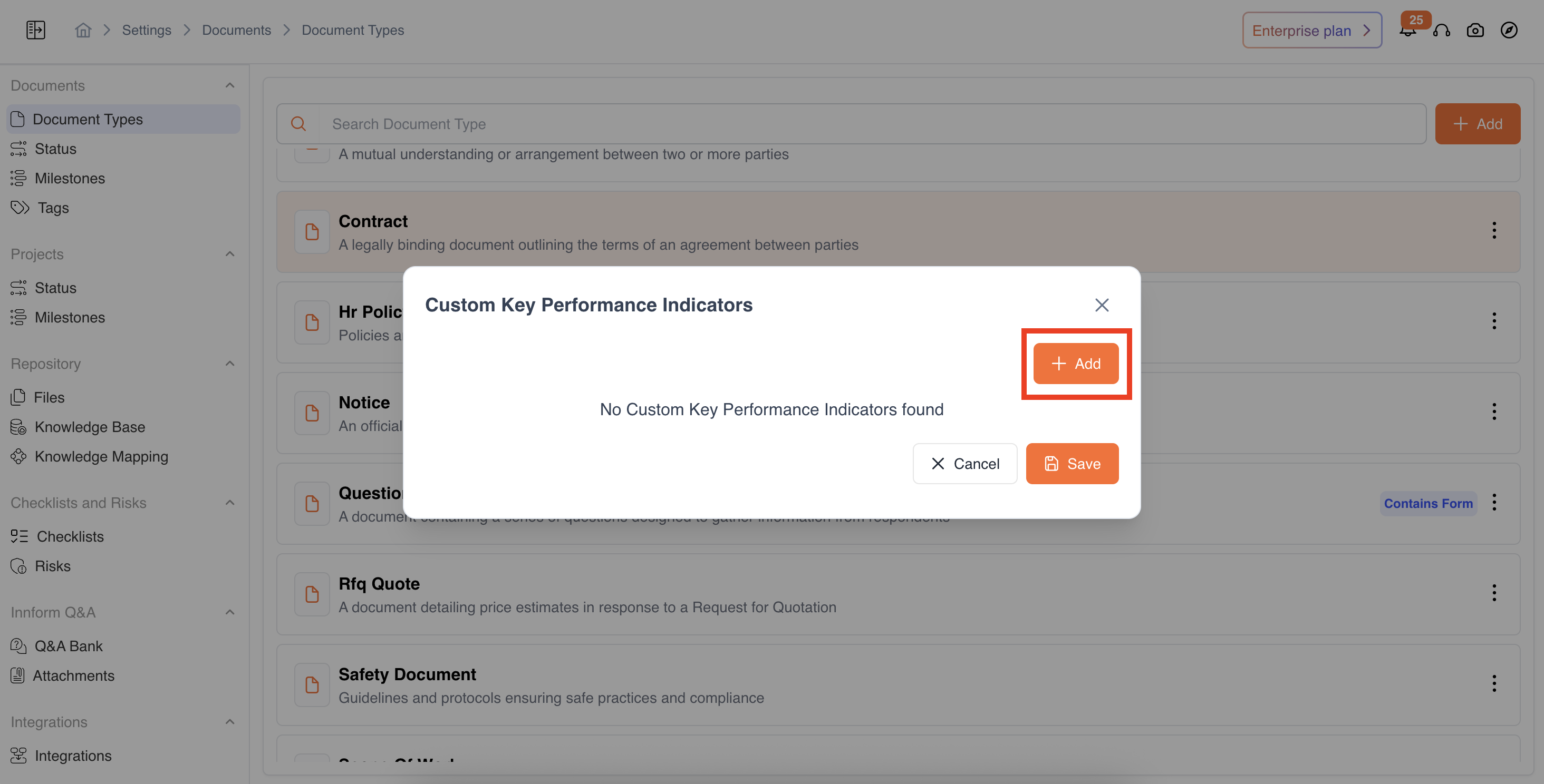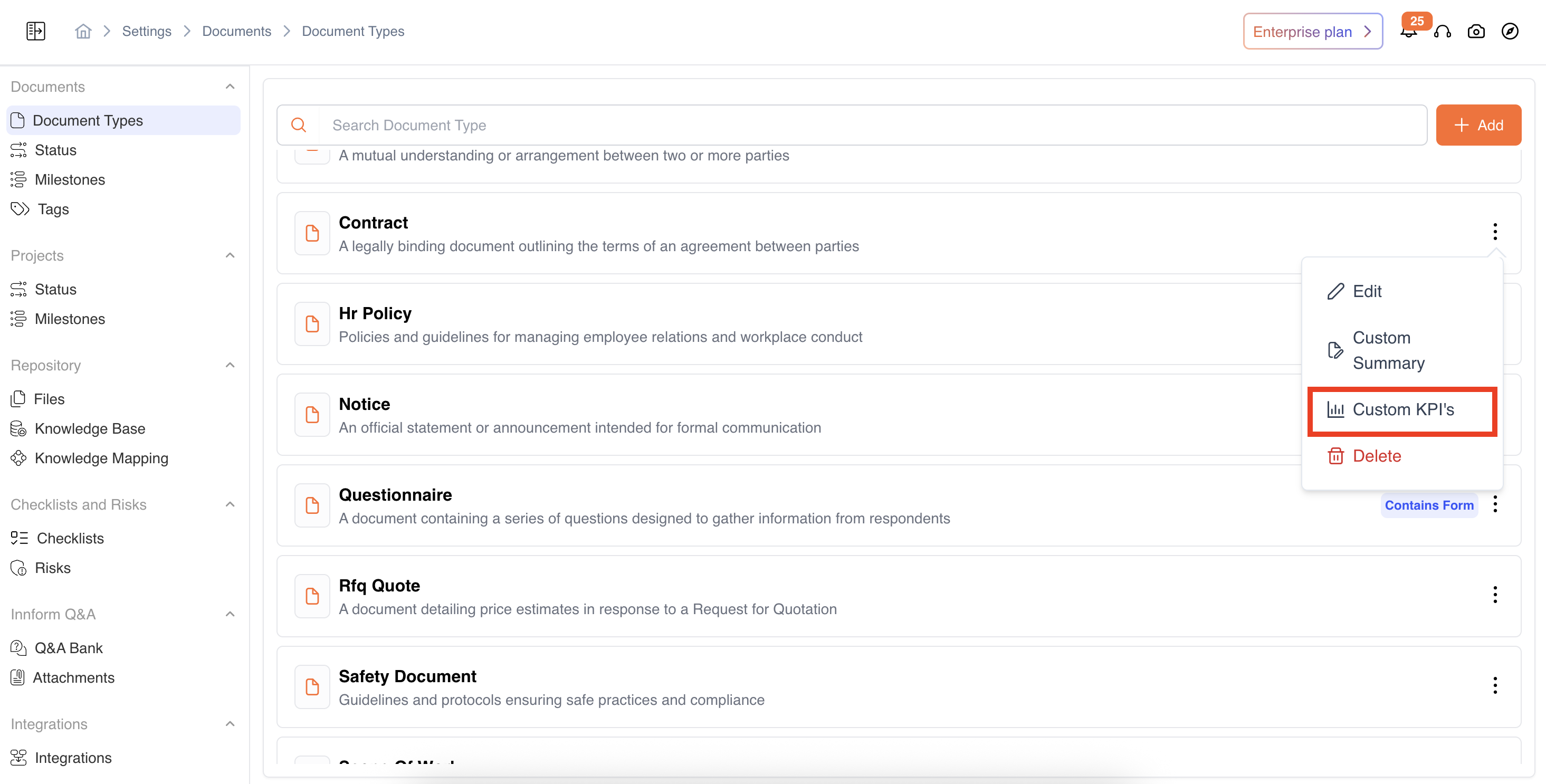 Users can define the Key Performance Indicators based on specific organizational or project needs: Navigate: Settings → Documents → Document Type → Options → Custom KPIs