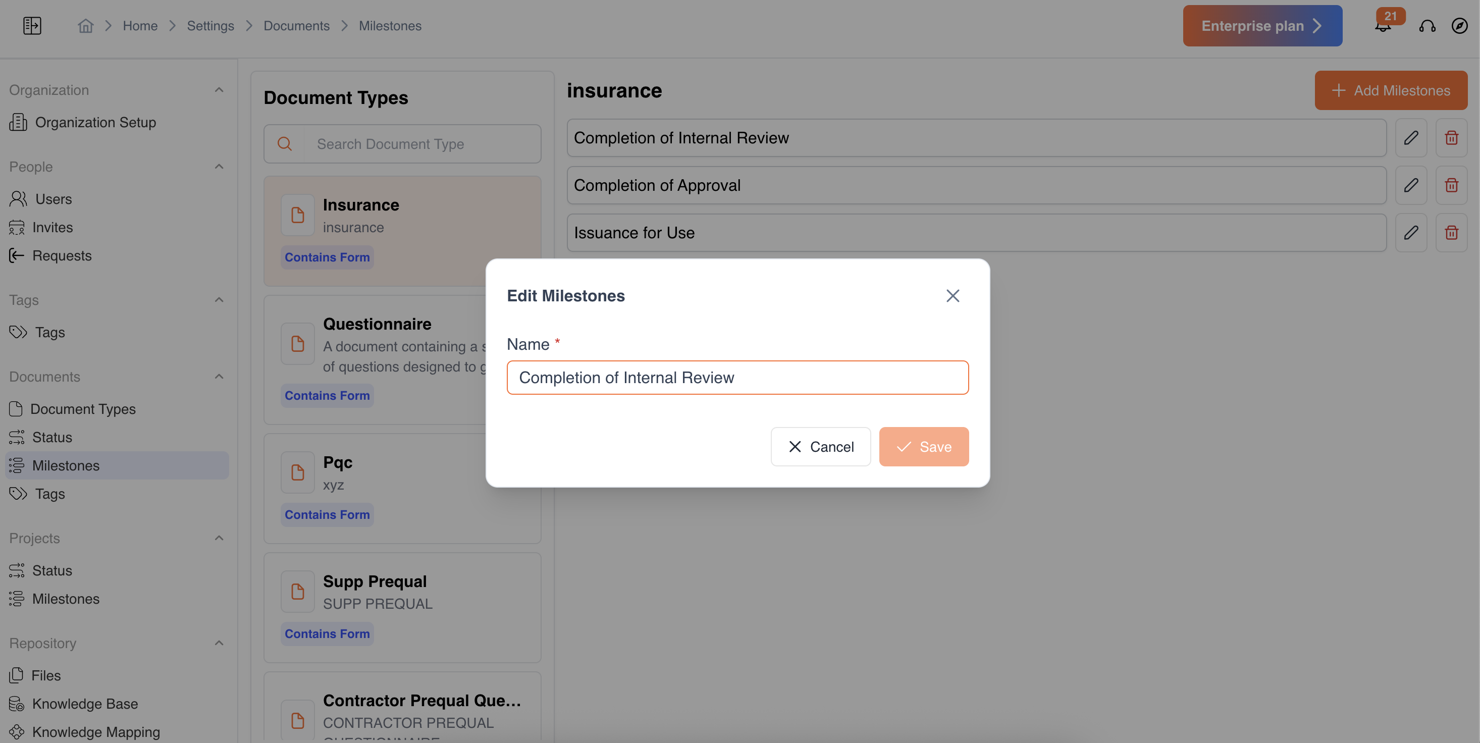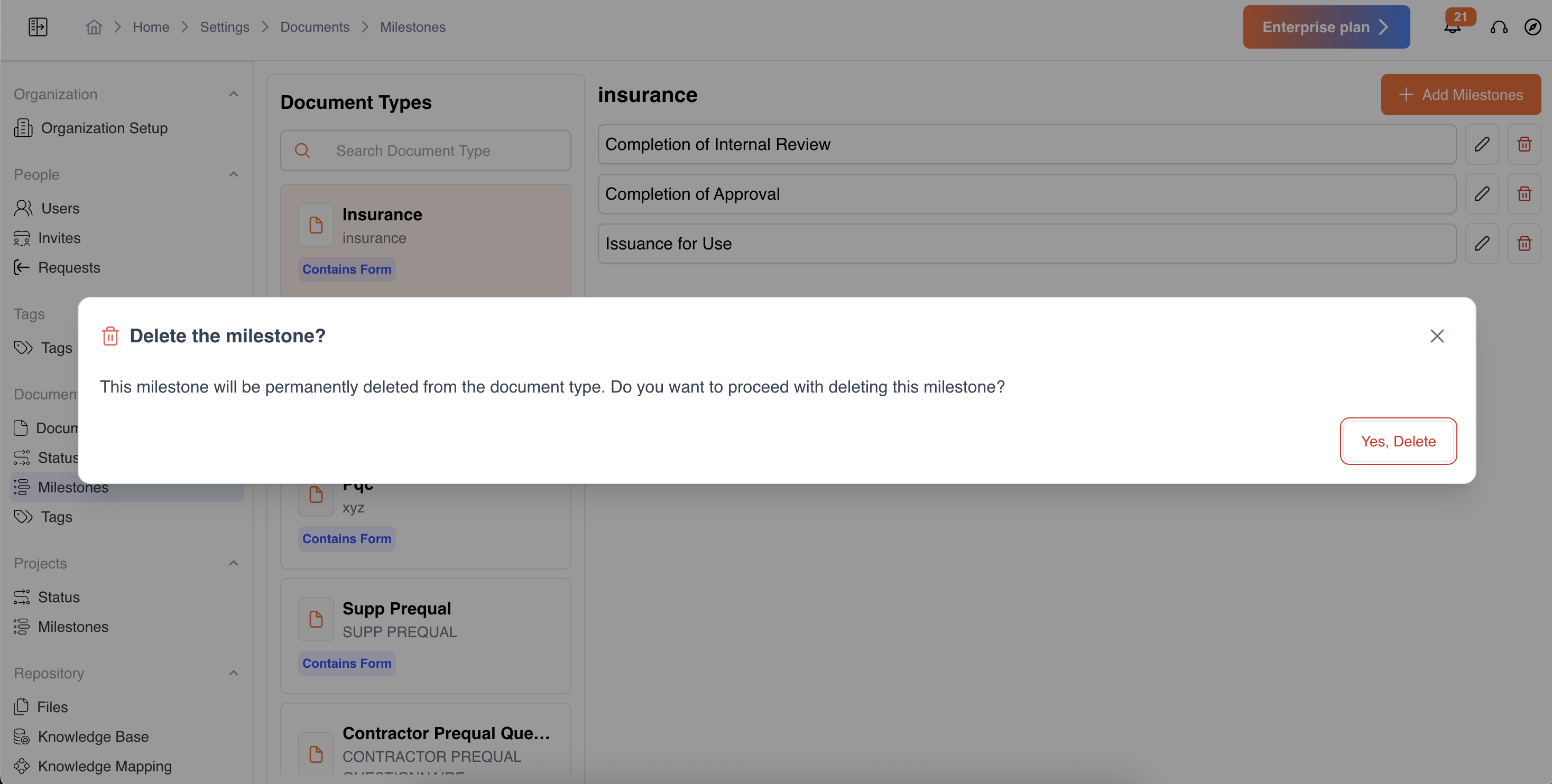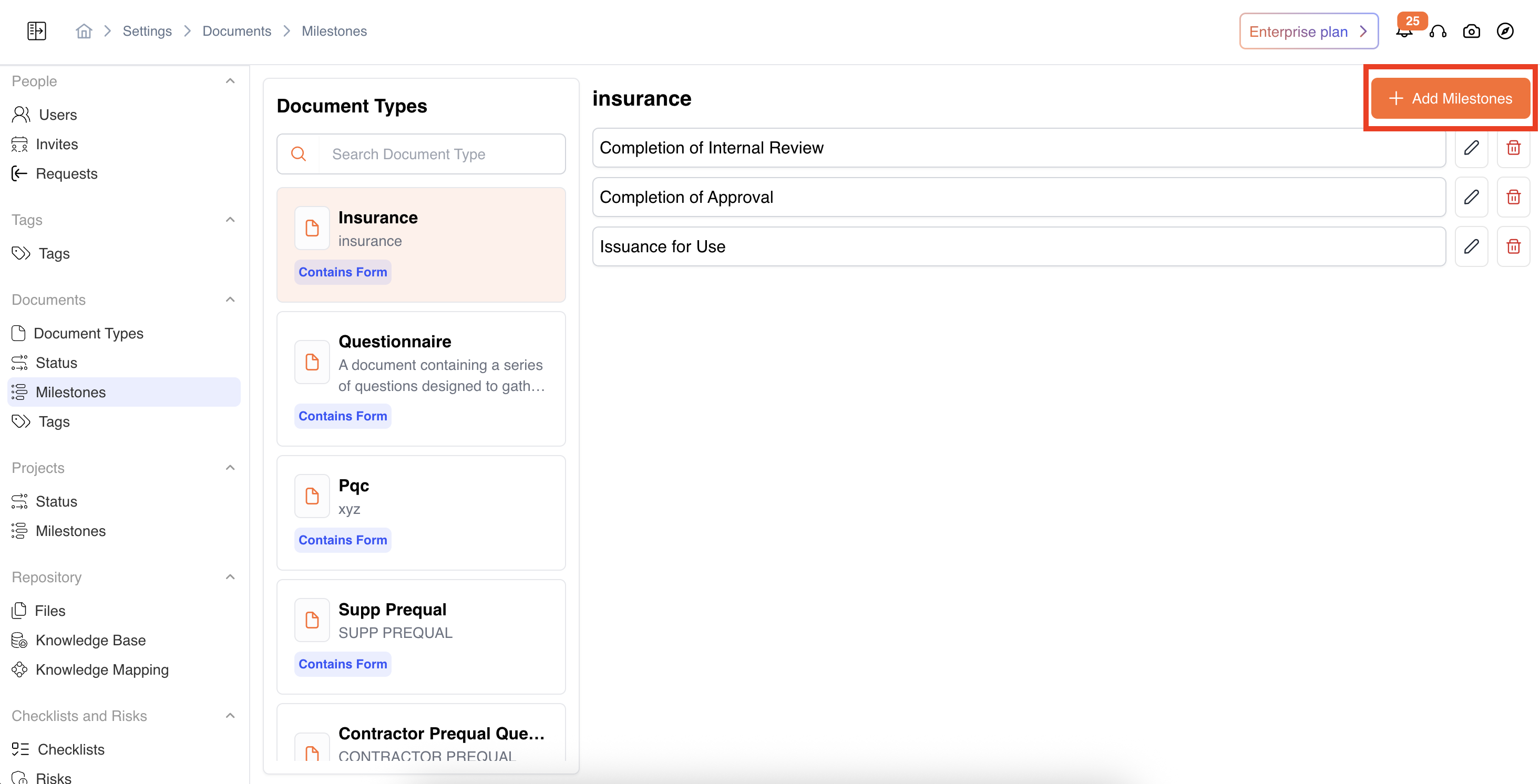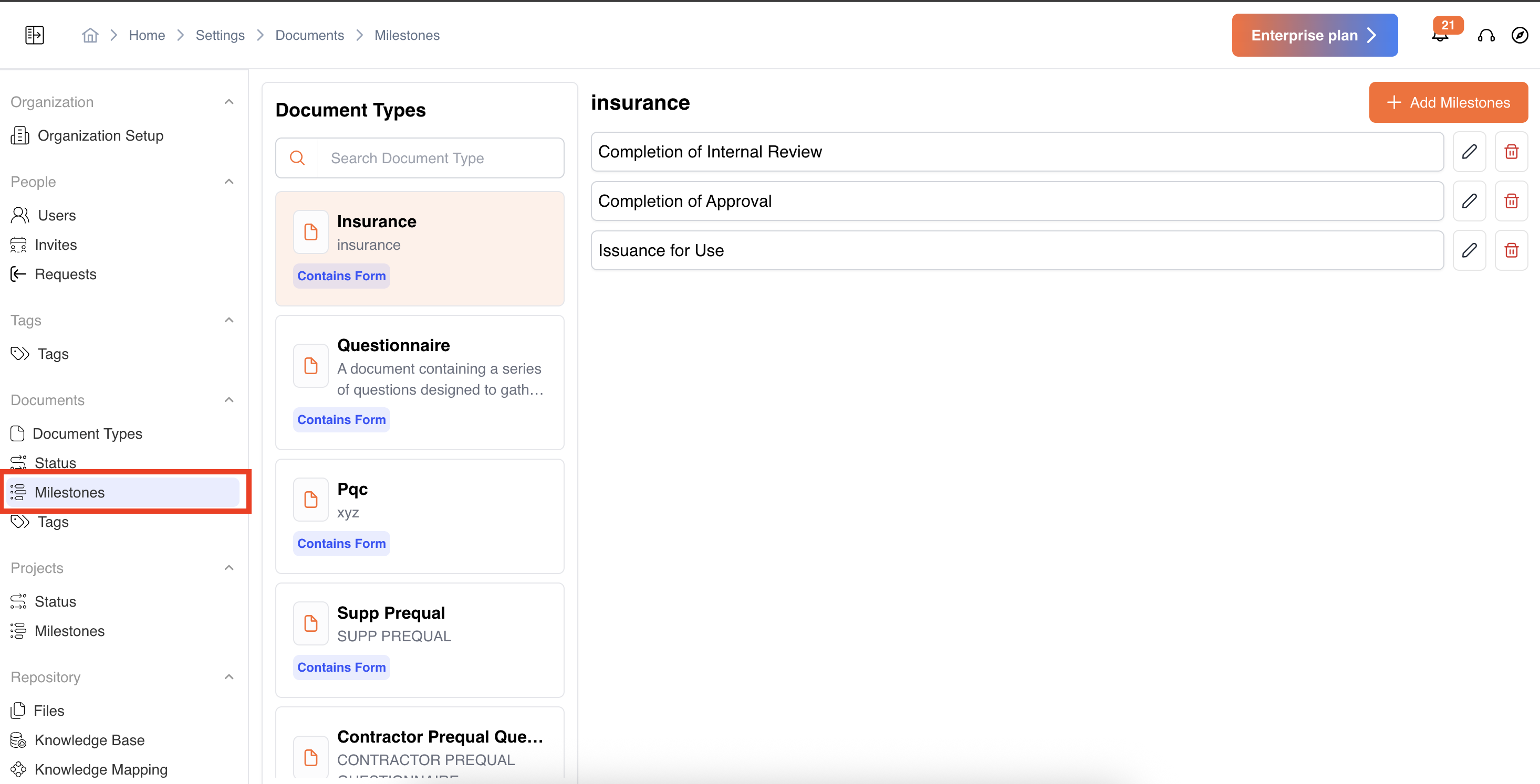 - Navigate to Settings → Documents → Milestones