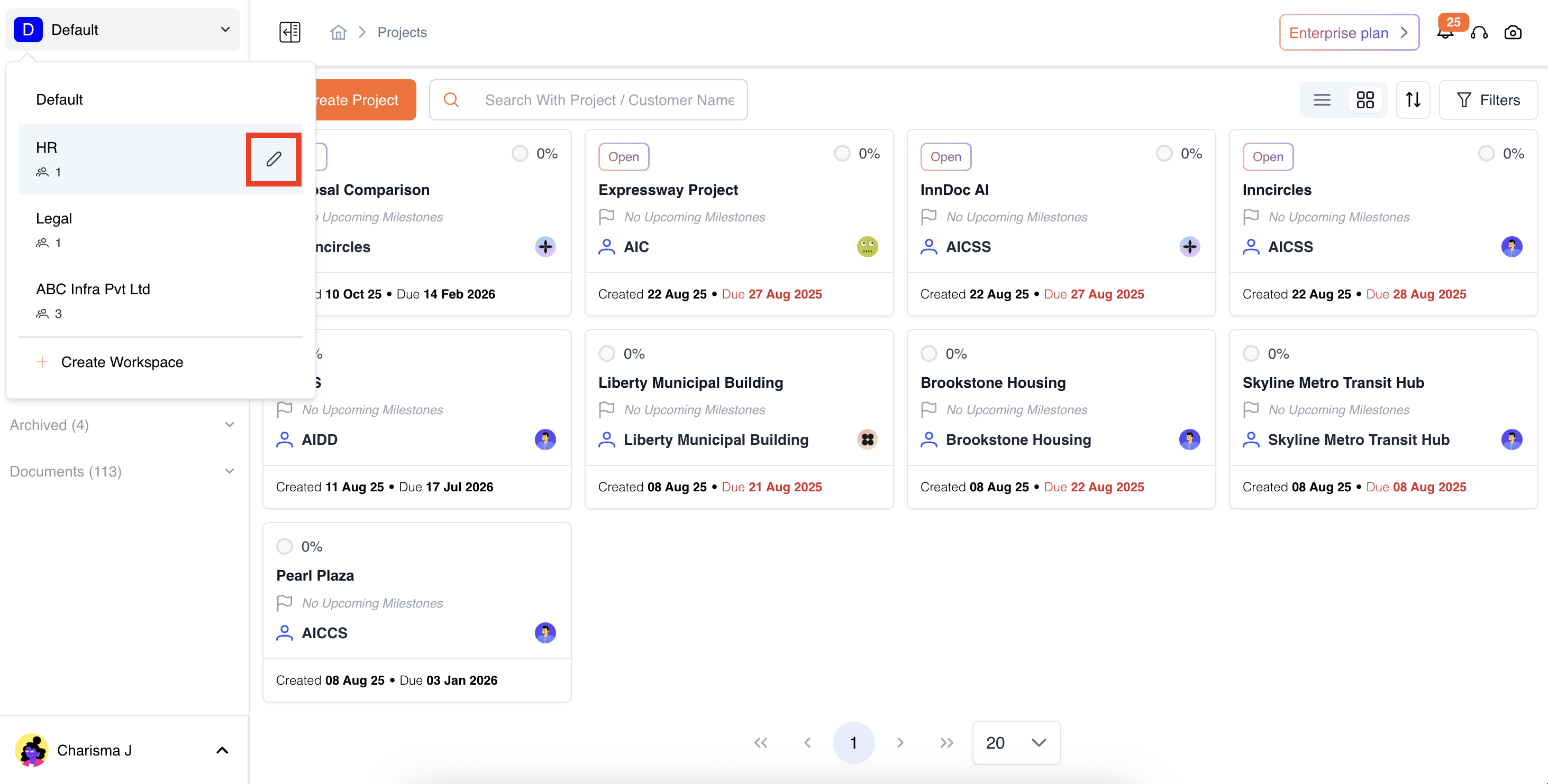 - Click on a workspace name to instantly switch context (projects, documents, members).