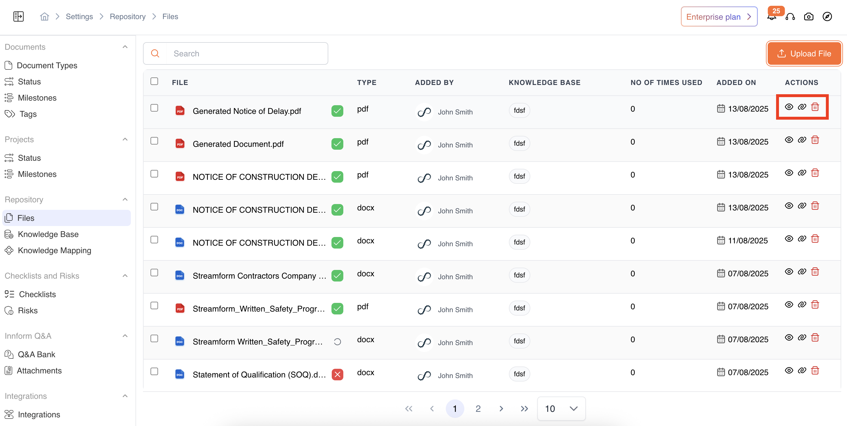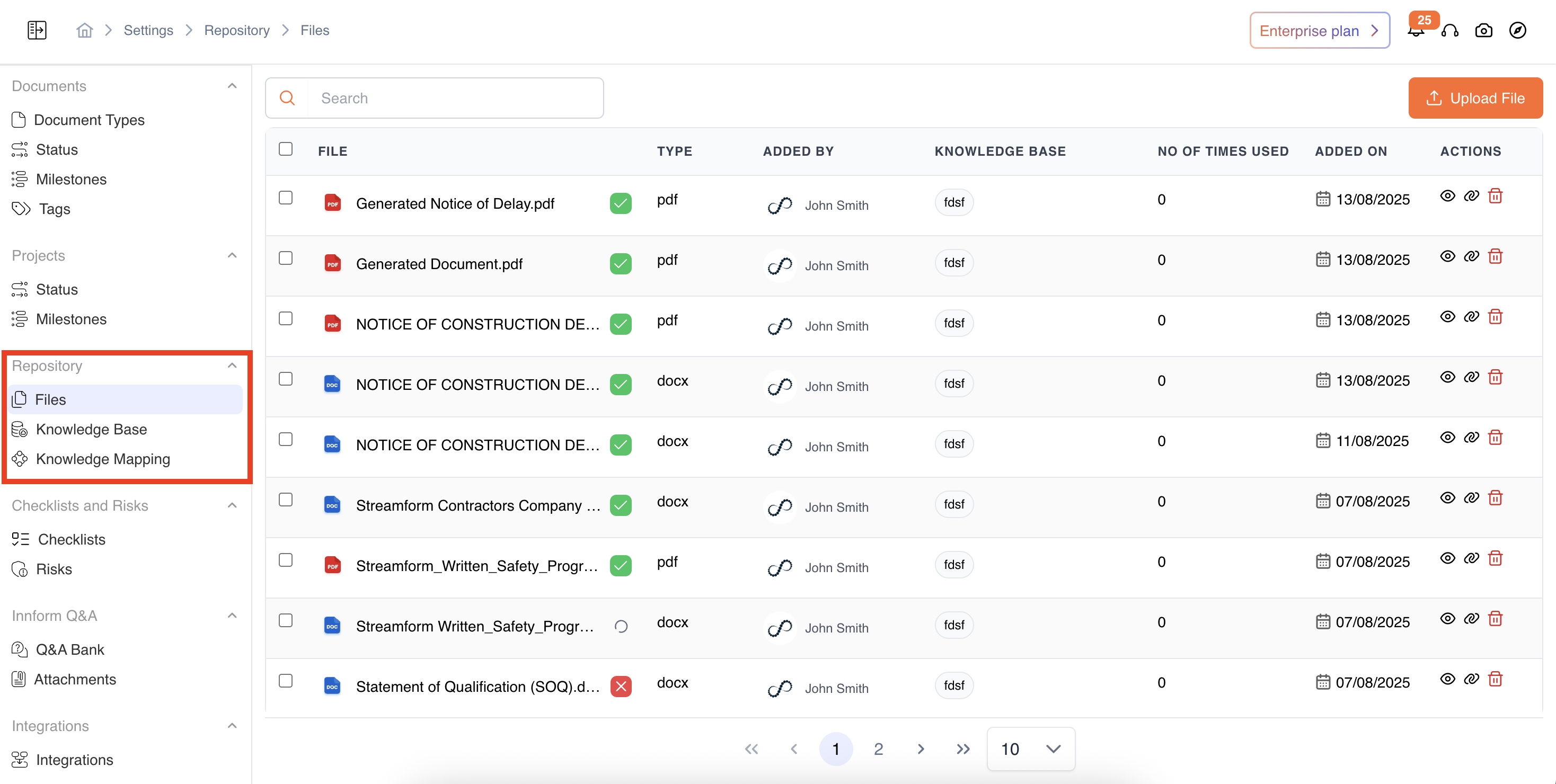 All uploaded files are displayed in a list format under Settings-> Repository-> Files. Each file shows the following metadata: