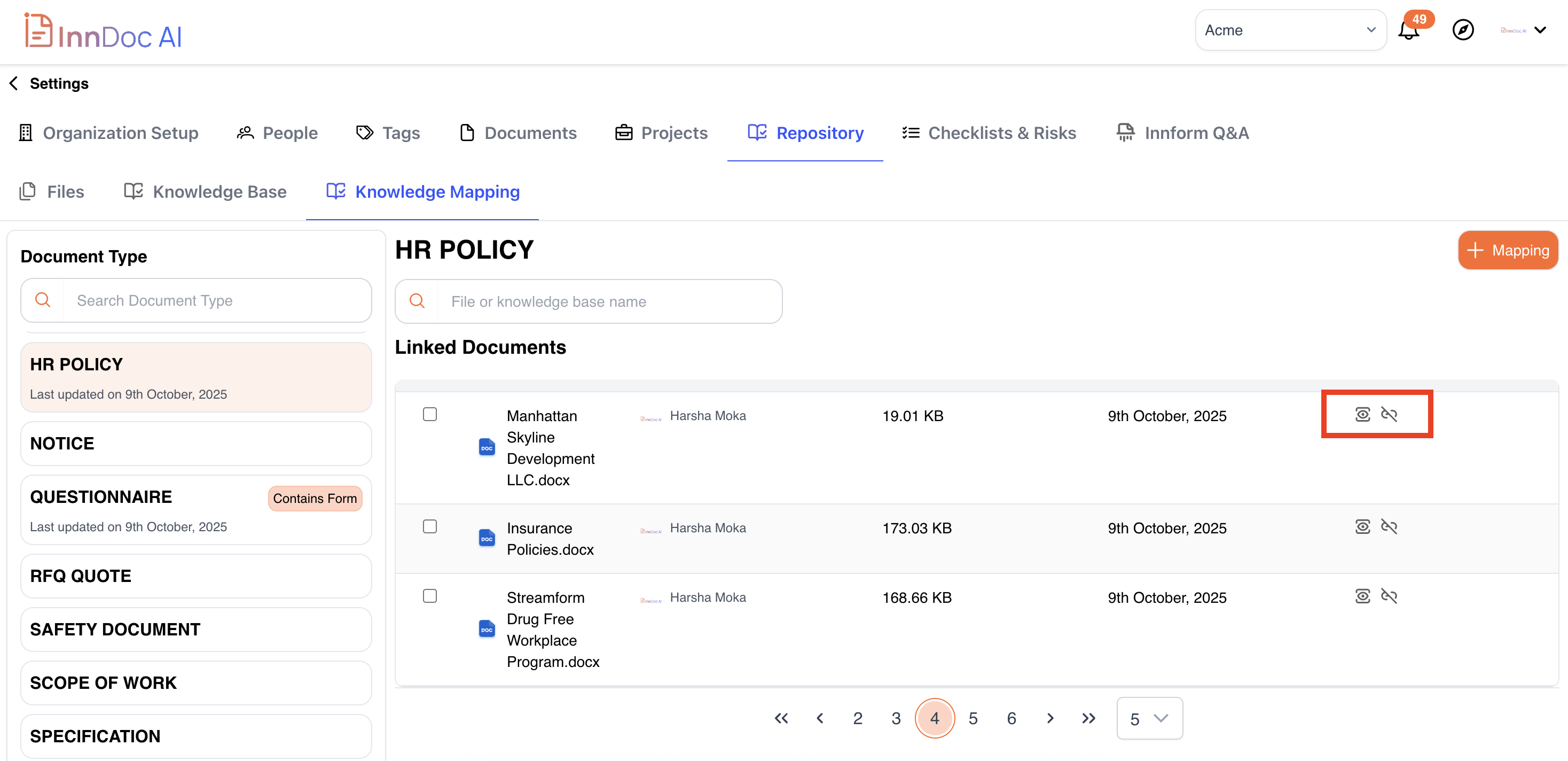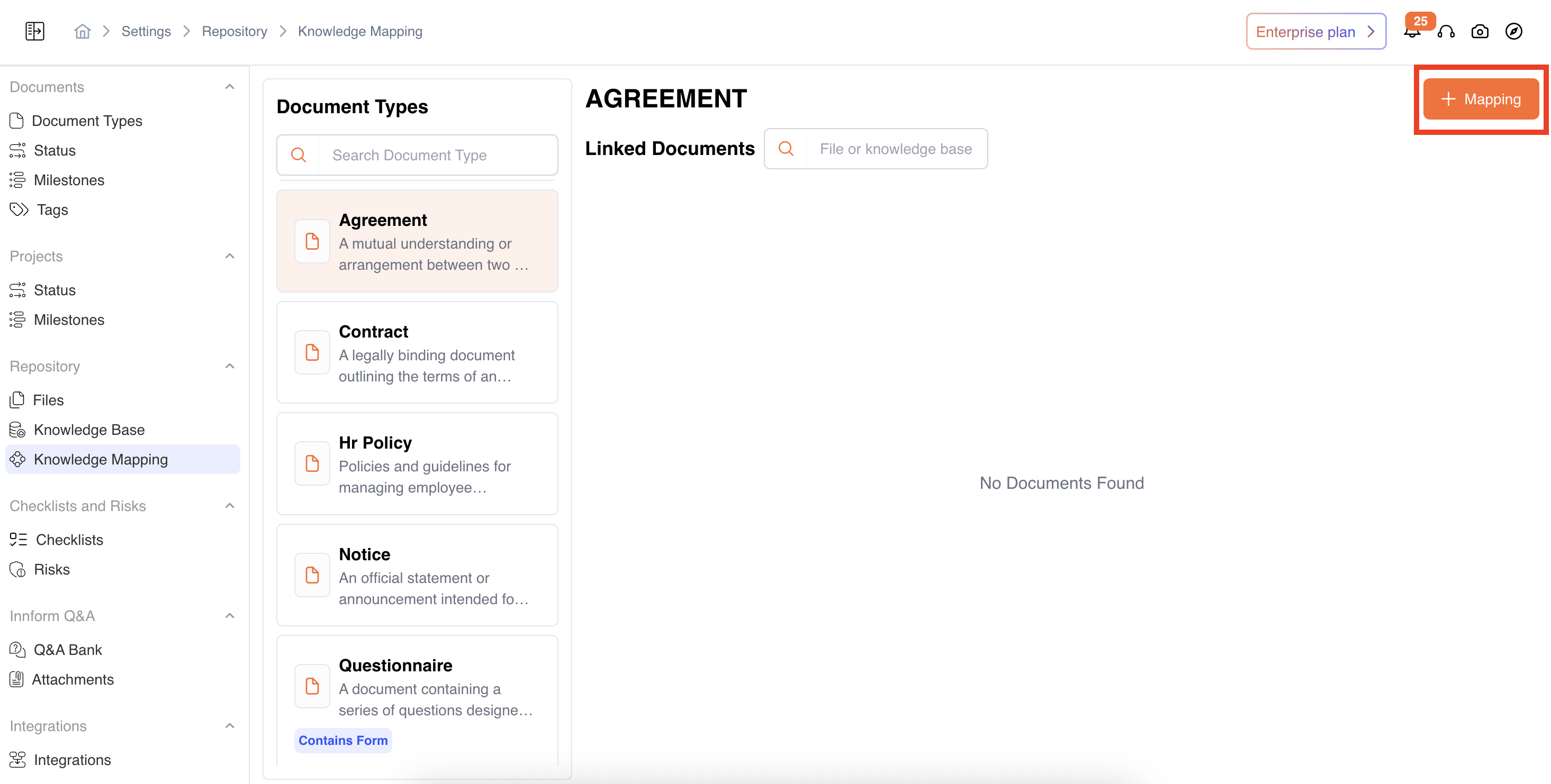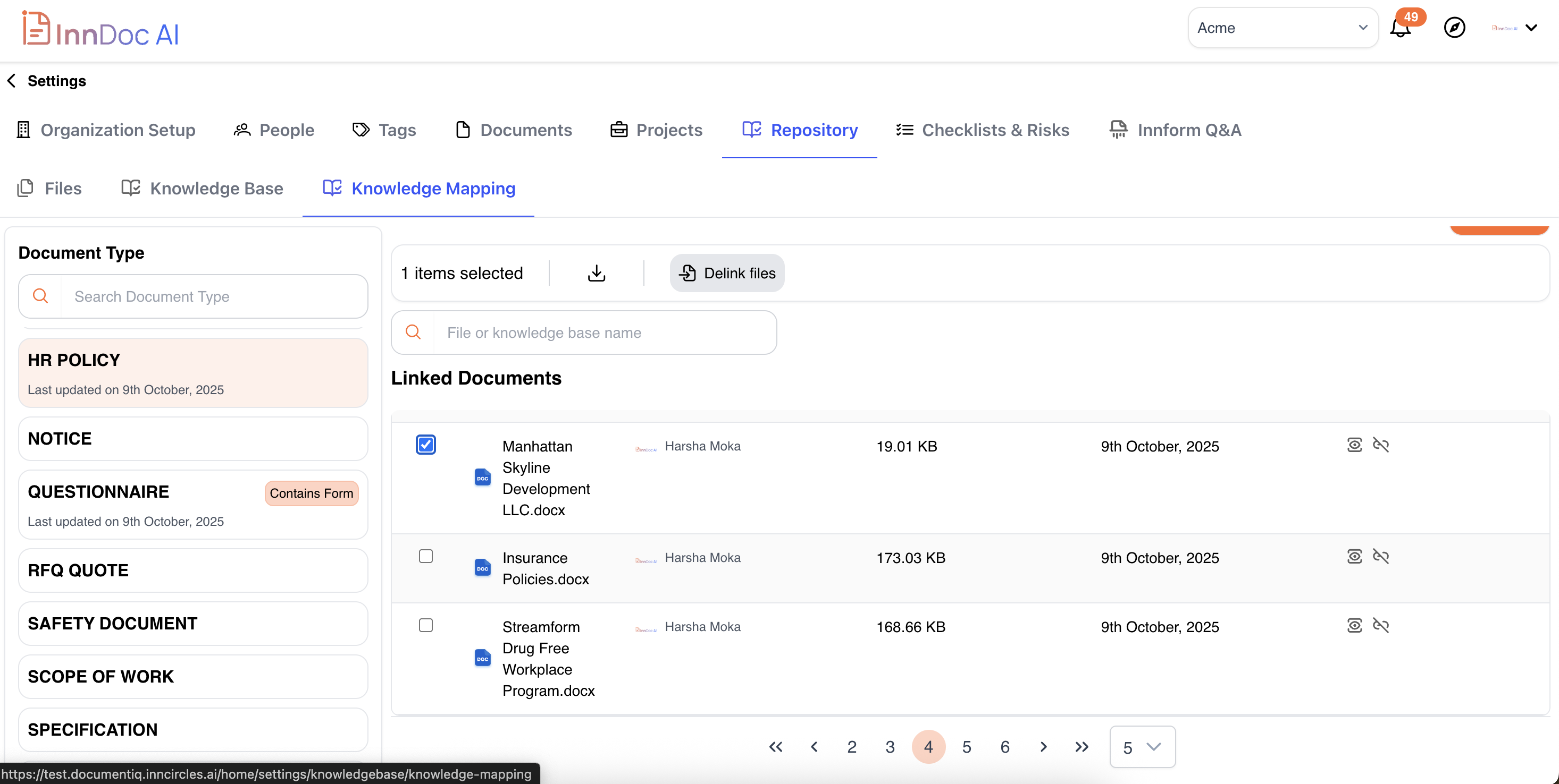 Knowledge Mapping allows users to associate files and knowledge bases with specific document types so that whenever you work on a document of that type, the relevant references are automatically available. This eliminates repetitive linking and ensures consistency across projects and questionnaires.