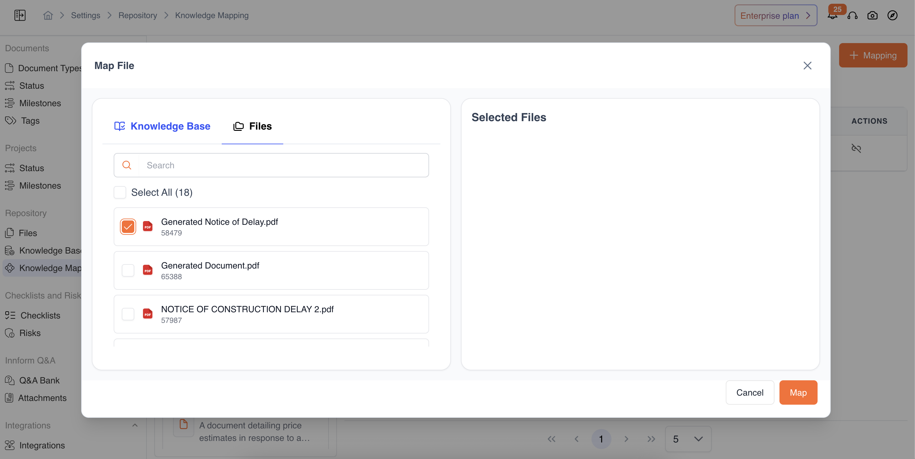 Supports mapping single or multiple knowledge bases/files to a document type.