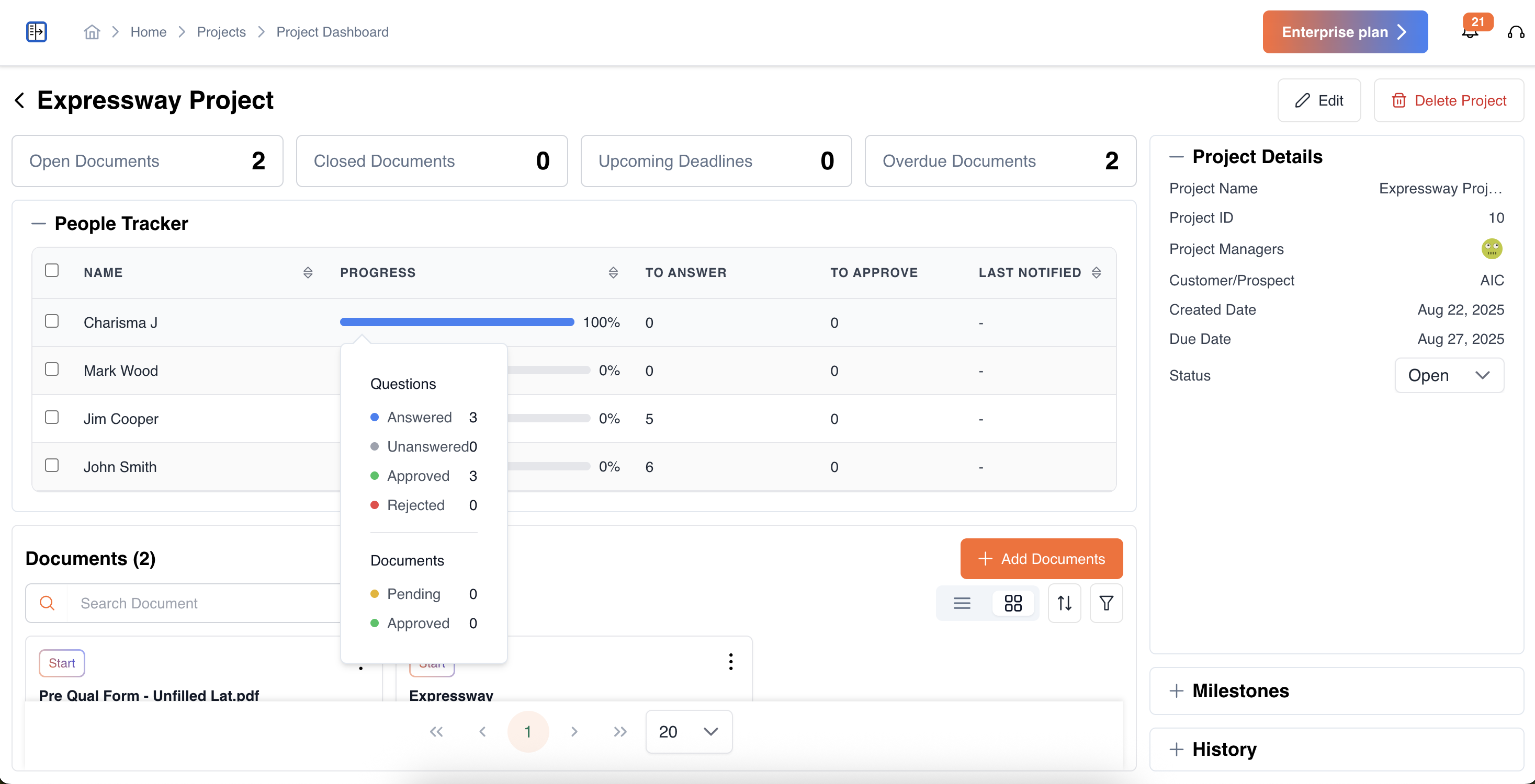 - Pending documents: Documents assigned to the team member that are awaiting action or approval.