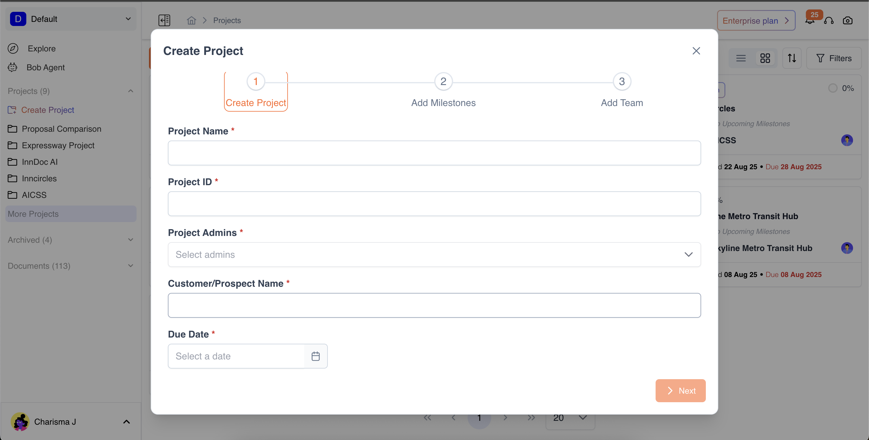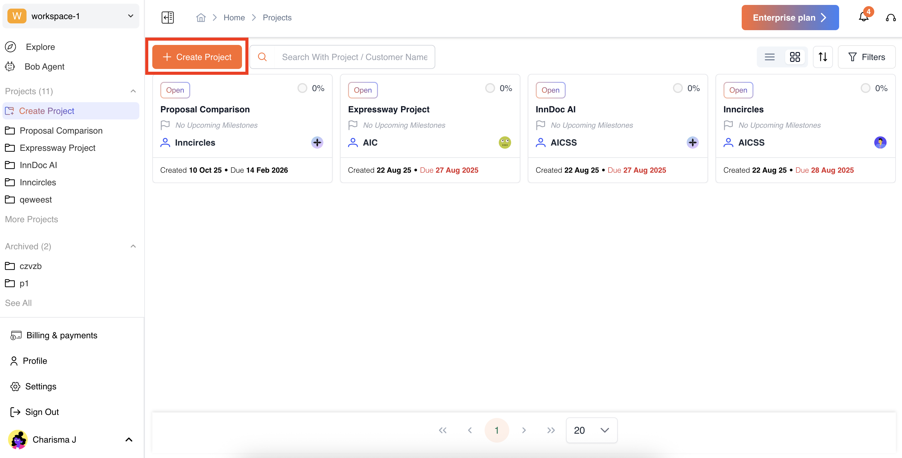 - Create Project: Under Projects tab from your workspace home screen, click Create Project.